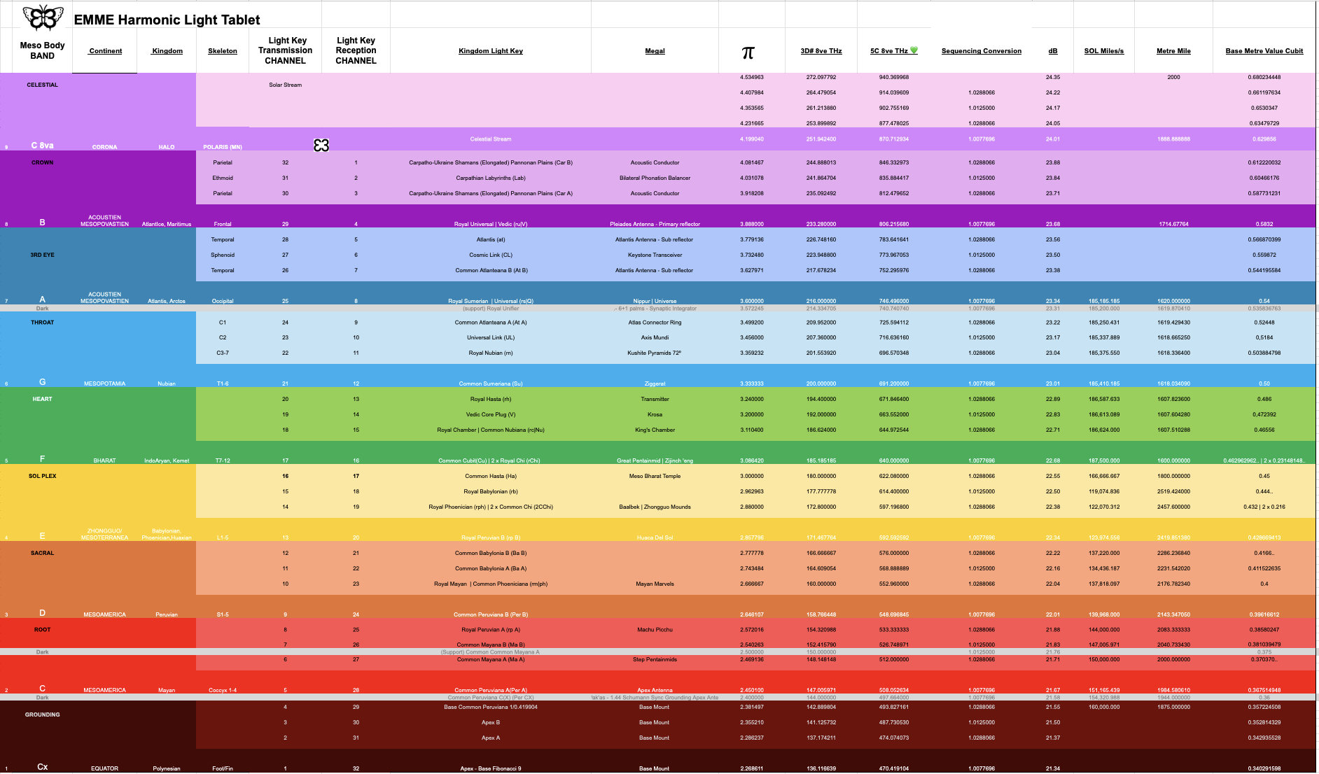 When all of our ancient solar light speed measurement systems are mapped as a multidimensional Harmonic Light Tablet, something beyond amazing appears: The precessionally aligned light frequency rainbow bridge resounds. This follows the ascending and descending scales attuned to the EMME Light Body Harmonics.