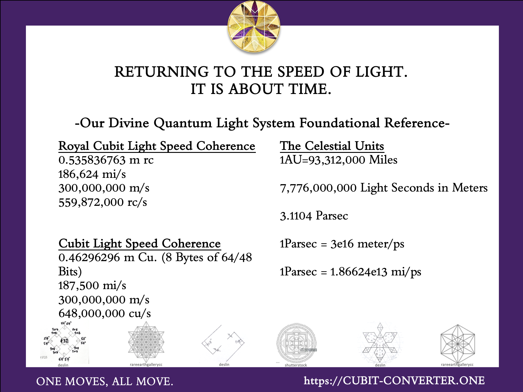 At this time, to accomplish ongoing assessment and realignment, we created the Cubit Unit Converter to correct the errored Foot, Inch, 2 Yards etc. All our original Light System values, and corrected unit conversions from today’s standards, are prepopulated in synchronisation for collective realignment with precise Light timing (SOL) cadences. This tool is freely accessible to all. Please feel free to use it and support the ongoing collective validation.