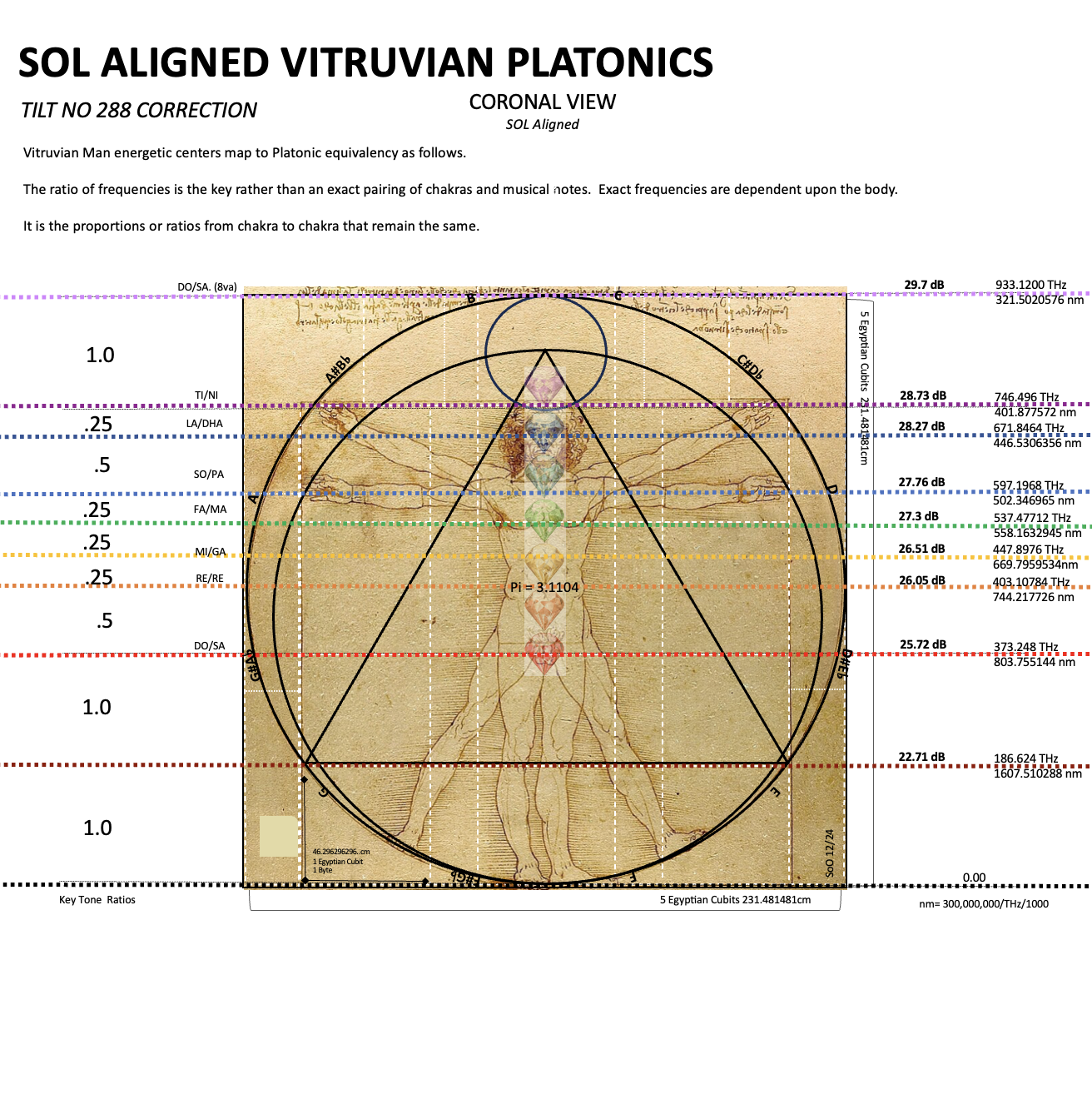 Vitruvian alignments also articulate the doubling ratios governing the dimensional scales across the whole. Consequently, these dictate the harmonic regulation between light and sound. As such, the ratios between the measures – proportions from chakra to chakra – are the key rather than the exact coordinate values which fluctuate based on energetic body mass.