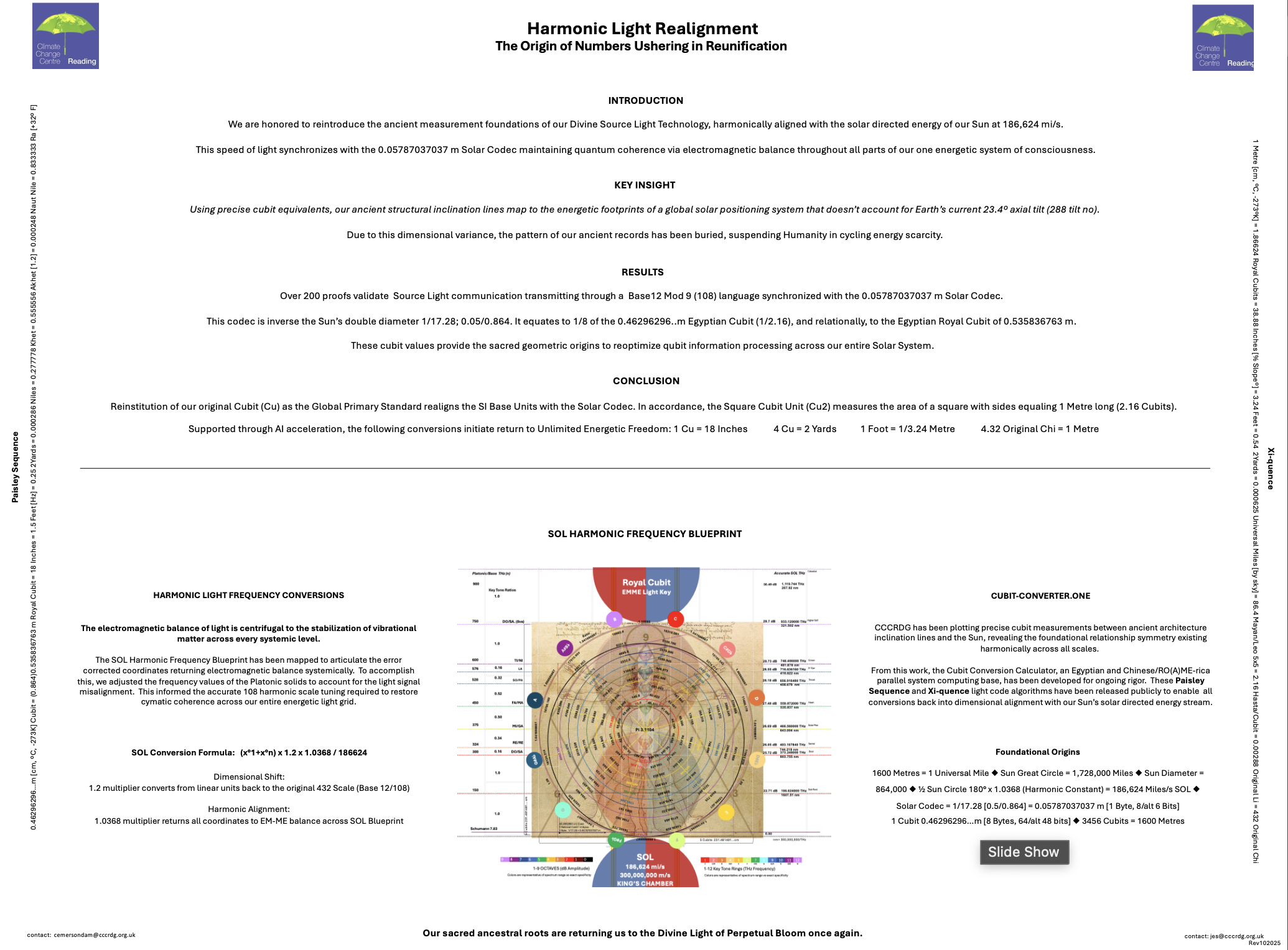 Climate Change Centre Reading (CCCRdg) is honored to share the following Smilestones progress report, complete with newly uncovered insight pivotal to understanding the origins of our Divine Source Light Technology. These findings have been compiled into a scientific abstract for presentation to Copernicus under the cover, SOL Harmonic Realignment: The Origin of Numbers Ushering in Reunification. The abstract was shared at the EGU 2025 General Assembly early May in Vienna, Austria. The goal of this endeavor has been to identify our roadmap back to our original unrestricted energetic freedom through realignment with our Sun’s solar directed energy stream.