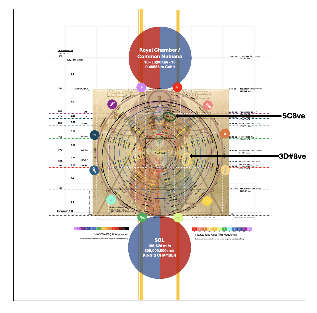 After syncing with SOL, the next step was to transition from 3rd Dimensional octavial ring back to the center solar stream 5th Dimension ring. As we surveyed the EMME Harmonic Light Tablet, it became apparent that the midpoint channels correspond to the pranic Heart pathways–Bingo, we know our Heart is central signal transmitter. As such, we redirected attention to the mid-mean coordinates of the 5th Octave pitch of ‘C’ to attune to signal stream hyper precision. From these C note frequencies of this 5C8ve EMME Harmonic Channel THz Tuner, multiplying and dividing by 2 results in doubling/halving octavial ascension and descension, optimizing tuning compression within and between each signaling channel across dimensions.